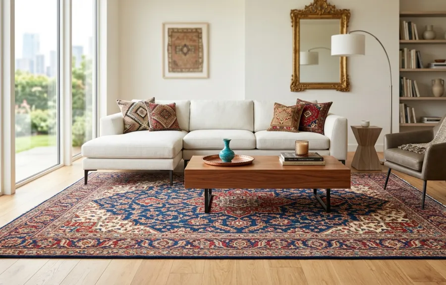 The second path is Deliberate Contrast. If your furniture is all sleek, grey, and modular, a rich indigo or deep saffron Tabriz rug provides the “visual tension” needed to make the room pop. My top tip? Use the “front-legs rule”—ensure at least the front legs of your sofa and chairs sit on the rug to unify the seating area.